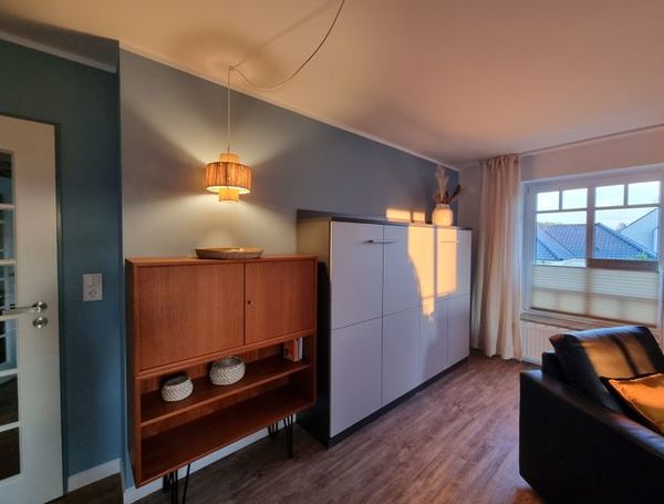 Die renovierte und neu eingerichtete, helle und strandnahe Ferienwohnung "Strandperle" verfügt über 69 qm Wohnfläche, aufgeteilt in: großer Flur mit Garderobe; Wohnraum mit Wandklappbett (1,40m x 2,00m), Essbereich und Sofaecke, HD-Flachbild-TV und Bluetooth-Box; Glasfaser-WLAN; separate, voll ausgestattete Küche mit Glaskeramikherd, Geschirrspüler, Mikrowelle, Kaffeemaschine, Wasserkocher und Toaster; Schlafraum mit Doppelbett (2x1,00m x 2,00m) und Arbeitsplatz; geräumiges Bad mit Wanne; möblierter Balkon zur Westseite; PKW Stellplatz direkt am Haus. Meerblick aus dem Küchenfenster.