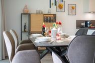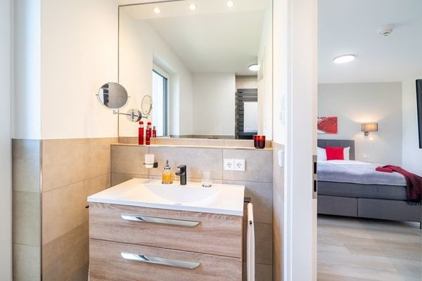 Informationen für Gäste mit Mobilitätseinschränkung: Der Zugang vom Carportstellplatz bis zum Hauseingang ist barrierefrei gestaltet. Direkt vor dem Haus befindet sich eine Kurzzeitparkfläche, die für Be- und Entladevorgänge genutzt werden kann. Die Distanz von der Carportanlage bis zur Hauseingangstür beträgt etwa 30 Meter. Die Breite der Haustür beträgt 100 cm und weist eine Schwelle von etwa 1,5 cm Höhe auf. Der Aufzug im Treppenhaus bedient alle Etagen des Hauses, einschließlich des Freizeit- und Saunabereichs im Untergeschoss. Die Türbreite des Aufzugs beträgt 90 cm, die Tiefe liegt bei 130 cm. Die schwellenlose Wohnungstür weist eine Breite von 90 cm auf. Die Breiten der schwellenlosen Zimmertüren liegen bei 80 cm (Ausnahme: Türbreite von der Abstellkammer beträgt 70 cm). Der schwellenlose Duscheingang im en suite Badezimmer weist eine Breite von 90 cm auf, die Tiefe liegt bei 200 cm. Auf Wunsch kann ein Duschhocker kostenfrei zur Verfügung gestellt werden. Die Waschtische sind nicht unterfahrbar und Haltegriffe sind nicht in den Badezimmern vorhanden. Der Duscheingang im zweiten Badezimmer weist eine Breite von 90 cm auf. Die Höhe der Duschtasse beträgt 1 cm. Die Betten weisen eine Höhe von 65 cm auf und sind unterfahrbar (max. 10 cm). Die Terrassenschiebetür lässt sich auf eine Breite von 130 cm öffnen, die Höhe der Schwelle beträgt 1,5 cm. Die Sauna im Untergeschoss ist schwellenlos erreichbar. Die Schwelle am Saunaeingang beträgt 10 cm, die Breite der Saunatür beträgt 60 cm. Die Breite der Tür zum Ruheraum beträgt 90 cm und weist eine Schwelle von etwa 2 cm auf.
