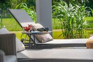 Die 20 m² große, überdachte Sonnenterrasse bietet reichlich Platz für Entspannung und Geselligkeit. Ein großer Esstisch mit sechs Stühlen lädt zu gemeinsamen Mahlzeiten ein, während die gemütliche Sitzgruppe mit zwei verstellbaren Relaxsesseln samt Fußhockern perfekte Plätze für entspannte Stunden bieten. Sonnenanbeterinnen und Sonnenanbeter können es sich auf den zwei bequemen Sonnenliegen gemütlich machen und ausgiebige Sonnenbäder genießen.