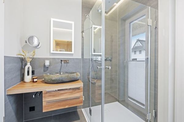 Das Bad mit großer ebenerdiger Dusche und gemütlicher Sauna bietet direkten Zugang zum Garten. 4 große Saunatücher liegen für Sie bereit.