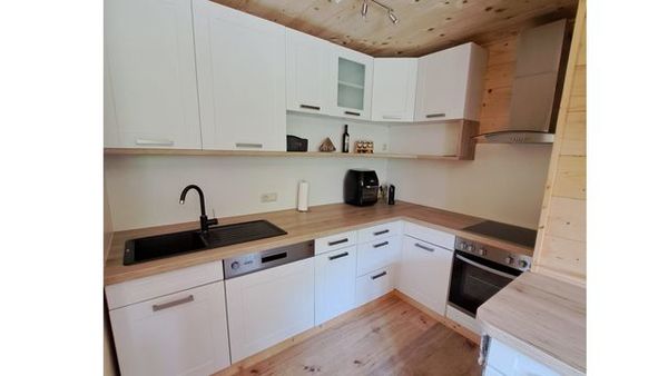 Die ganze Wohnung ist neu, individuell gestaltet und mit naturgelassenem Fichtenholz vom Hausherrn im länglichen Stil kreiert.