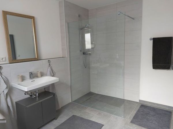 Das Bad ist ausgestattet mit einer begehbaren Dusche, Waschmaschine und Fön.