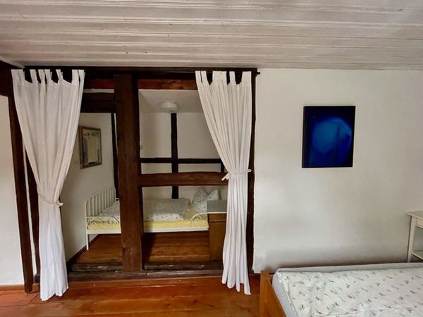 Zur Ferienwohnung gehören eine kleine Küche, ein Esszimmer für 68 Personen mit Bibliothek, ein Wohnraum mit Kamin im Erdgeschoss sowie zwei Schlafräume und eine Schlafnische im Obergeschoss. Sie ist für 4 Personen geeignet. Bei Bedarf sind 3 Aufbettungen möglich. Die Treppe ins Dachgeschoss ist für Menschen mit Gehbehinderung nicht geeignet. Eine Kindersicherung ist vorhanden. Die Wohnung ist komfortabel ausgestattet.