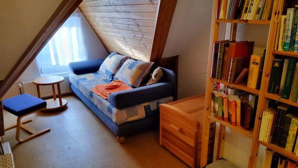- Ferienwohnung (1.Etage) verfügt über 2 Etagen (1.Etage: Flur, Küche, Esszimmer, Schlafzimmer, Bad; 2.Etage/ Dachgeschoss: Bücher-Boden und 2. Schalfzimmer)