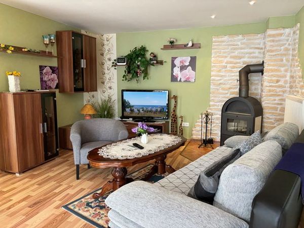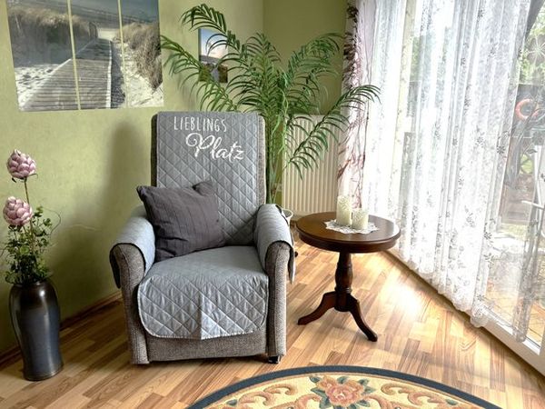 Bereits im Eingangsbereich lockt die Unterkunft mit ihrer liebevollen Einrichtung im Landhausstil, welche sich durch die gesamte Wohnung durchzieht. Aus dem Flur kommt man direkt in das großzügige Wohnzimmer mit Sitzlandschaft und einer eigenen Sitzecke, welche zum gemütlichen Lesen am Abend einlädt.