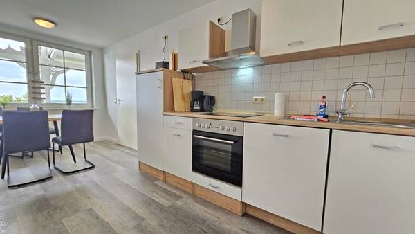 - Die separate Küche bietet eine Küchenzeile die ausgestattet ist mit Herd, Backofen, Geschirrspüler, Kaffeemaschine, Wasserkocher, Toaster sowie die üblichen Utensilien. Weiterhin gibt es einen Essplatz mit 4 Stühlen.