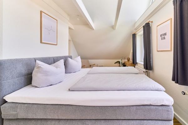 Führen Sie Ihren Rundgang fort und gelangen Sie über einen kleinen Flur in das gemütliche Schlafzimmer mit Boxspringbett (1,80m x2,00m) und Einbauschränken. Angrenzend befindet sich das komplett neu renovierte Badezimmer mit einer ebenerdigen Dusche sowie einer Badewanne für besondere Entspannungsmomente. Kosmetikspiegel und Haartrockner sind selbstverständlich vorhanden.