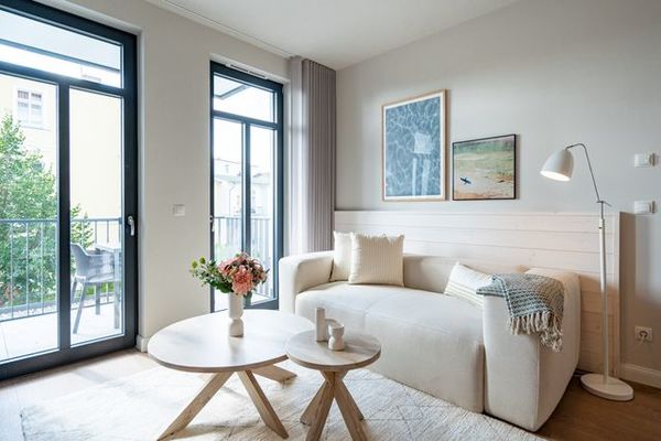 Schon beim Eintreten sagt die Seele: Hier will ich verweilen und zur Ruhe kommen. In diesem modernen und wunderschön eingerichteten 3-Raum-Appartement in der 1. Etage empfängt Sie auf 50 Quadratmetern ein echtes Wohlfühlreich für 2 Personen. Ein geräumiges Wohnzimmer, ein Schlafzimmer zum Träumen und zwei Balkone und alles ist lichtdurchflutet und modern eingerichtet. Die hellen Sandtöne des Interieurs erinnern an den Ostseestrand, der nur knapp 80 Meter von dieser Wohnung entfernt ist und auf den Sie von den beiden Balkonen aus, einen seitlichen Blick werfen können. Der offene Wohn- und Essbereich ist mit einer Küchenzeile mit hochwertigen Siemens-Elektrogeräten voll ausgestattet. Auf dem Sofa kann man es sich vor dem Elektro-Kamin (ohne Wärmeerzeugung) so richtig gemütlich machen. Für Unterhaltung sorgt ein 50-Zoll-Flachbildfernseher. Wer auch im Urlaub produktiv sein möchte oder den lieben Zuhausegebliebenen noch ganz klassisch eine Ansichtskarte schreiben möchte, kann dies an der Working Station tun. Der Essplatz lädt zu gemeinsamen Mahlzeiten ein und der Zugang zum ersten Balkon mit Ausrichtung Süd-Ost ermöglicht es Ihnen, die Sonne zu genießen und die Ostseeluft tief einzuatmen. Das Schlafzimmer verwöhnt Sie mit einem komfortablen Boxspringdoppelbett (1,80m x 2,00m), einem Kleiderschrank, einer Kommode und einem zusätzlichen 43-Zoll-Flachbildfernseher. Von hier aus können Sie morgens gleich nach dem Aufwachen auf den zweiten Balkon (ebenfalls Süd-Ost ausgerichtet) hinaustreten und den Tag mit einem weiten Blick über das Meeresblau beginnen. Begrüßen Sie von hier aus die aufgehende Sonne. Das innenliegende Bad ist mit einer Dusche, einem WC, einem Waschtisch und einer Infrarotsauna ausgestattet. Schalten Sie bei einem kuscheligen Saunagang ihr Kopfkino einfach mal aus und genießen Sie die wohlige Wärme, die durch Sie hindurchströmt. Ihre ganz persönliche, kleine Wellnessoase. In der Tiefgarage steht Ihnen ein PKW-Stellplatz zur Verfügung. Sie brauchen also nur noch ankommen und bei Meeresrauschen relaxen. ***Aktueller Hinweis: Bis auf weiteres finden Ausbauarbeiten im Penthouse sowie vereinzelte Arbeiten im Gebäude statt. Zudem werden auch die derzeit ungenutzten Gewerbeflächen im Erdgeschoss zu Restaurants und anderen Einrichtungen ausgebaut. Während dieser Zeit kann es zu optischen und akustischen Beeinträchtigungen kommen. Wir danken Ihnen für Ihr Verständnis und freuen uns auf Ihren Besuch! *** Die 2024 fertig gestellte Strandterrasse liegt direkt an der belebten Strandpromenade und bietet einen einzigartigen Ausblick auf die Grand Dame der historischen Seebrücken sowie die historische Konzertmuschel, einem beliebten Treffpunkt für Kunst und Kultur. Dahinter liegt die Ostsee ein Panorama, das zu den schönsten in den Kaiserbädern gehört. Es ist wie das Abtauchen in eine andere Zeit. In eine Zeit, in der man mit Stock, Sonnenschirm und Hut fürs Sehen und gesehen werden über die Promenade schlenderte; aber auch in eine Zeit, in der damals wie heute Zeit einmal für eine kurze Weile keine Rolle spielt. Weil man angekommen ist im Loslassen, Entspannen und Genießen. Es ist dieser besondere Geruch nach Meeresluft und Freiheit, der in Erinnerung bleibt. Dazu die Bilder, die man mitnimmt. Von langen Strandspaziergängen, vom Lachen in fröhlich schäumenden Ostseewellen, von der Zeit in einem wunderschönen Urlaubsdomizil. Denn genau das ist die Strandterrasse mit ihren 56 modernen und exklusiven Ferienappartements direkt gegenüber der Ahlbecker Seebrücke. Die Ein-, Zwei- oder Dreizimmerwohnungen zwischen 40 und 70 Quadratmeter groß sind von einer Innenarchitektin gemeinsam mit unserem Erfahrungsschatz an Gästewünschen mit viel Liebe zum Detail und ganz individuell konzipiert worden. Entspannung und Wohlfühlen stehen an erster Stelle. Alles ist aufeinander abgestimmt und sorgt für eine gemütliche Atmosphäre. Wählen Sie zwischen einem Domizil in einem hellen, sandfarbenen Designkonzept oder einem Appartement mit anthrazitfarbenen Farbakzenten. Alle Appartements verfügen gleichermaßen über eine stilvolle und komfortable Einrichtung, die passgenau angefertigt worden ist, sowie über moderne Küchen und Bäder. Jedem Schlafzimmer ist ein eigenes Bad mit Dusche zugeordnet (außer App. B4.5). Die Appartements besitzen fast alle einen Balkon viele schauen sogar zur Ostsee hinaus. Die meisten Feriendomizile haben einen Elektrokamin und Infrarotsaunen. Im Erdgeschoss befindet sich ein separater Gemeinschaftsraum für Fahrräder. Außerdem besteht die Möglichkeit, im Gemeinschaftswaschraum 2 Waschmaschinen [&] Trockner zu nutzen. Ergänzt wird das Angebot durch eine Gemeinschaftssauna, die täglich von 11:00 bis 22:00 Uhr nutzbar ist. In der Tiefgarage (Einfahrtshöhe 2,03 Meter) steht für jede Wohnung 1 Pkw-Stellplatz zur Verfügung. Ist alles zur Zufriedenheit untergebracht? Dann kann der Urlaub ja beginnen. Und beim Blick vom Balkon über die Ostsee treffen sich zum Sonnenaufgang das Heute und das Damals. Gelassenheit legt sich beim Gang hinunter an den Strand auf die Seele. Jetzt darf die Zeit stehenbleiben.