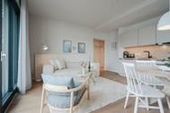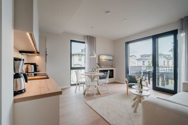 Wer nordisches Design mag, wird sich auf Anhieb in dieses stilvolle Urlaubszuhause für bis zu 4 Personen verlieben. Die 61 Quadratmeter des 3-Raum-Appartements B 1.8 im Haus B der Strandterrasse sind ein absoluter Wohntraum. Hier werden Sie sich von der ersten Sekunde an wohlfühlen. Das mit viel Liebe eingerichtete Feriendomizil wartet mit einem geräumigen Wohn-Esszimmer auf. Eine Relaxarea mit Geschmack und viel Komfort. Warme Farben sorgen für viel Gemütlichkeit. Das Sofa nebst superschönem und vor allem bequemem Sessel eignet sich wunderbar zum Entspannen und für Filmabende auf dem Flat-TV (43 Zoll). Eine romantische Atmosphäre verströmt der Elektrokamin (ohne Wärmeabgabe). Die zum Wohnzimmer hin offene Küche ist mit modernen Elektrogeräten ausgestattet. Dazu gehören ein Backofen, ein 4-Platten-Induktionsherd, ein Geschirrspüler, ein Toaster, eine Kaffeemaschine und einer Nespresso-Kapselmaschine. Genießen Sie das Essen gemeinsam am Esstisch, der auch ausreichend Platz für Spieleabende bietet. Was jedoch wäre ein Ostseeurlaub ohne Ostsee? Vom Wohnzimmer aus können Sie auf einen Nord-Ost-Balkon hinaustreten, von dem aus Sie seitlich aufs Meer hinausschauen können. Atmen Sie die frische Luft tief ein. Essen unter freiem Himmel wird am Balkontisch mit vier Stühlen möglich wenn nicht gerade der Strand ruft. Da Meeresluft bekanntlich müde macht, werden Sie in den komfortablen Boxspringdoppelbetten (2,00m x 2,00m und 1,80m x2,00m) in den beiden Schlafzimmern ganz sicher wunderbar schlafen können. Jedes Schlafzimmer verfügt zudem über einen großen Kleiderschrank und einen Flat-TV (43 Zoll). Zwei moderne Duschbäder mit Waschtisch und WC bieten Ihnen allen Komfort und Privatsphäre. Parken Sie bequem auf dem zu Ihrer Wohnung gehörenden PKW-Stellplatz. Mehr braucht es für einen erholsamen Urlaub am Meer nicht. Wir wünschen Ihnen ein schönes Ankommen, Auspacken und Wohlfühlen. ***Aktueller Hinweis: Bis auf weiteres finden Ausbauarbeiten im Penthouse sowie vereinzelte Arbeiten im Gebäude statt. Zudem werden auch die derzeit ungenutzten Gewerbeflächen im Erdgeschoss zu Restaurants und anderen Einrichtungen ausgebaut. Während dieser Zeit kann es zu optischen und akustischen Beeinträchtigungen kommen. Wir danken Ihnen für Ihr Verständnis und freuen uns auf Ihren Besuch! *** Die 2024 fertig gestellte Strandterrasse liegt direkt an der belebten Strandpromenade und bietet einen einzigartigen Ausblick auf die Grand Dame der historischen Seebrücken sowie die historische Konzertmuschel, einem beliebten Treffpunkt für Kunst und Kultur. Dahinter liegt die Ostsee ein Panorama, das zu den schönsten in den Kaiserbädern gehört. Es ist wie das Abtauchen in eine andere Zeit. In eine Zeit, in der man mit Stock, Sonnenschirm und Hut fürs Sehen und gesehen werden über die Promenade schlenderte; aber auch in eine Zeit, in der damals wie heute Zeit einmal für eine kurze Weile keine Rolle spielt. Weil man angekommen ist im Loslassen, Entspannen und Genießen. Es ist dieser besondere Geruch nach Meeresluft und Freiheit, der in Erinnerung bleibt. Dazu die Bilder, die man mitnimmt. Von langen Strandspaziergängen, vom Lachen in fröhlich schäumenden Ostseewellen, von der Zeit in einem wunderschönen Urlaubsdomizil. Denn genau das ist die Strandterrasse mit ihren 56 modernen und exklusiven Ferienappartements direkt gegenüber der Ahlbecker Seebrücke. Die Ein-, Zwei- oder Dreizimmerwohnungen zwischen 40 und 70 Quadratmeter groß sind von einer Innenarchitektin gemeinsam mit unserem Erfahrungsschatz an Gästewünschen mit viel Liebe zum Detail und ganz individuell konzipiert worden. Entspannung und Wohlfühlen stehen an erster Stelle. Alles ist aufeinander abgestimmt und sorgt für eine gemütliche Atmosphäre. Wählen Sie zwischen einem Domizil in einem hellen, sandfarbenen Designkonzept oder einem Appartement mit anthrazitfarbenen Farbakzenten. Alle Appartements verfügen gleichermaßen über eine stilvolle und komfortable Einrichtung, die passgenau angefertigt worden ist, sowie über moderne Küchen und Bäder. Jedem Schlafzimmer ist ein eigenes Bad mit Dusche zugeordnet (außer App. B4.5). Die Appartements besitzen fast alle einen Balkon viele schauen sogar zur Ostsee hinaus. Die meisten Feriendomizile haben einen Elektrokamin und Infrarotsaunen. Im Erdgeschoss befindet sich ein separater Gemeinschaftsraum für Fahrräder. Außerdem besteht die Möglichkeit, im Gemeinschaftswaschraum 2 Waschmaschinen [&] Trockner zu nutzen. Ergänzt wird das Angebot durch eine Gemeinschaftssauna, die täglich von 11:00 bis 22:00 Uhr nutzbar ist. In der Tiefgarage (Einfahrtshöhe 2,03 Meter) steht für jede Wohnung 1 Pkw-Stellplatz zur Verfügung. Ist alles zur Zufriedenheit untergebracht? Dann kann der Urlaub ja beginnen. Und beim Blick vom Balkon über die Ostsee treffen sich zum Sonnenaufgang das Heute und das Damals. Gelassenheit legt sich beim Gang hinunter an den Strand auf die Seele. Jetzt darf die Zeit stehenbleiben.
