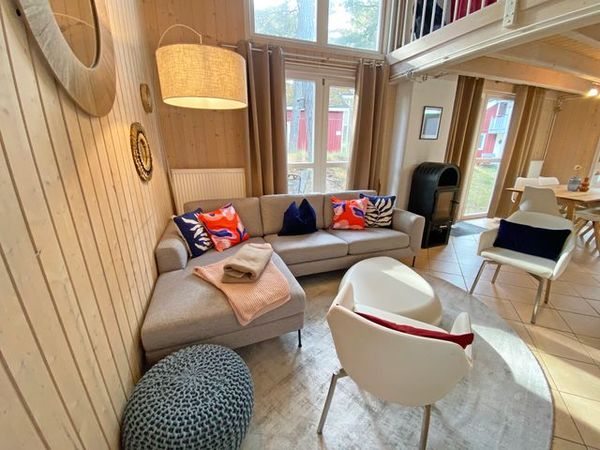 Das gemütliche ca. 85 m² große Nichtraucher Ferienhaus Villa Musica mit Kamin, Sauna und Whirlpool ist optimal geeignet für 6 Erwachsene + 1 Kleinkind bis 3 Jahre im Kinderreisebett. Durch einen kleinen Eingangsflur mit Garderobe betreten Sie Ihr Strandhaus. Im Erdgeschoss befindet sich der Wohn-/Essbereich mit gemütlicher Eckcouch, Smart-TV, DVD-Player und Bluetooth Soundbar. Auch auf einen Internetzugang (WLAN) brauchen Sie nicht verzichten. Dieser ist für Sie inklusive. Wer es abends gern noch ein bisschen gemütlicher mag, der zündet den Kamin im Wohnraum an und lässt den Tag ausklingen. Dem Wohnbereich angeschlossen ist die Einbauküche, die mit allen Geräten ausgestattet ist, wie Sie sie von zu Hause kennen, Geschirrspüler, Kühlschrank mit Gefrierfach, Ceranherd mit Backofen, Mikrowelle, Kaffeemaschine, Senseo Padmaschine, Wasserkocher, Toaster und diversen Küchenutensilien. Der große Esstisch bietet Platz für 6 Personen. Vom Wohnbereich gibt es einen direkten Zugang zur offenen Terrasse, die mit Terrassenmöbeln und Sonnenschirm ausgestattet ist. Das 1. Schlafzimmer befindet sich im Erdgeschoss und ist mit einem Doppelbett (1,60m x 2,00m) und Kleiderschrank ausgestattet. Das große Badzimmer verfügt über eine ebenerdige Dusche, Waschplatz, WC, Fön, Kosmetikspiegel, Waschmaschine, Sauna und Badewanne mit Whirlpool. Über eine Buchenholztreppe erreichen Sie das lichtdurchflutete Obergeschoss. Dort befinden sich 2 weitere Schlafzimmer das eine mit 2 Einzelbetten (0,90m x 2,00m) und das andere mit einem Doppelbett (1,80m x 2,00m). Zum Teil sind die Lattenroste verstellbar. Von beiden Schlafzimmern gelangen Sie auf den Balkon. In der offenen Galerie finden Sie ein großes E-Piano, Cajón, Akustikgitarre, Notenständer, Metronom, Bongos mit Ständer, Mundharmonika und einen Fernseher mit Chromecast. Hier können Sie Ihr musikalisches Talent auf die Probe stellen oder auch einfach nur auf einer Couch Relaxen. Ein zweites kleines Bad mit Dusche, WC, Waschplatz befindet sich zusätzlich im Obergeschoss. Das Haus verfügt im Untergeschoss über eine Fußbodenheizung und im ganzen Haus über eine Gaszentralheizung. Für die kleinen Gäste halten wir 1 x Hochstuhl bereit. Im Anbau können Sie Ihre Strandutensilien unterstellen. Dort finden Sie auch einen Sonnenschirm und Sonnenliegen. Auf dem Grundstück des Strandpark´s steht unseren Gästen ein PKW-Stellplatz Nr.244 zur Verfügung, der nur wenige Meter vom Haus entfernt ist. Ihre geliehenen oder mitgebrachten Fahrräder können Sie am Haus abstellen. Maximal 2 Haustiere sind gegen eine Gebühr gern gesehene Gäste. Die Erstausstattung eines Wäschepaketes (komplette Bettwäsche, 1 Duschhandtuch, 2 kleine Handtücher) können Sie bis 14 Tage vor Anreise gegen einen Aufpreis dazu buchen oder durch eigene ergänzen. Ab 2 gebuchten Paketen erhalten Sie einmalig 1 Geschirrhandtuch und 1 Duschvorleger hinzu.