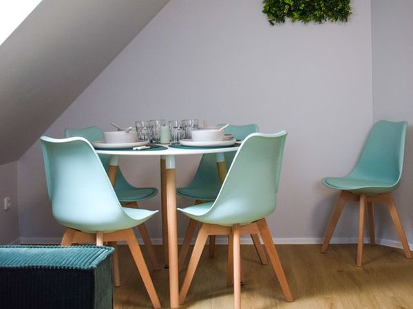 Unsere moderne und neu ausgestattete Wohnung bietet im 1. Obergeschoss auf 60 qm für bis zu sechs Personen Platz an, also ideal für Ihren Familienurlaub. Schlafbereich 1: Das Schlafzimmer ist mit einem großen Polsterbett von 180 x 200 cm aus fliederfarbenen Samt mit passenden Möbel und Deko in flieder/gold liebevoll ausgestattet. Schlafbereich 2: Unser zweiter Schlafbereich in gelb/orange gehalen hat zwei Betten von jeweils 90 x 200 cm, die man wahlweise zusammen als Ehebett oder einzeln nutzen kann sowie reichlich Stauraum in der Kommode. Wohnbereich: In unserem grünfarbenen Wohnbereich befindet sich eine gemütliche Eckchouch aus Cord mit Schlaffunktion und passenden Möbeln dazu. Essecke: Die Essecke lädt zum Frühstück am Morgen, mittags oder Dinner am Abend für bis zu 6 Personen ein. Bad: Das Bad ist mit einer Badewanne und einem Duschvorhang ausgestattet, das ebenso mit Liebe eingerichtet wurde. Küche: Unsere Küche ist klein, aber fein (Herd, Wasserkocher, Toaster, Kühlschrank mit Minibar).