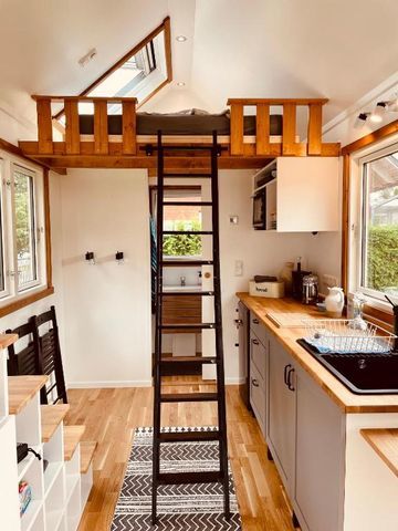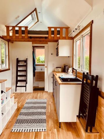 Der Raum ist hell und offen konzipiert, sodass Sie sich sofort wohlfühlen werden. Sie finden eine kleine, gemütliche Leseecke vor, perfekt, um in Ruhe zu entspannen. Über eine kleine Leiter erreichen Sie den gemütlichen Schlafraum im Dachgeschoss, ausgestattet mit einem bequemen Doppelbett (160x200 cm). Der Bereich ist perfekt für zwei Personen und bietet einen besonderen Rückzugsort im Tiny House. Eine kompakte, aber gut ausgestattete Küche steht Ihnen zur Verfügung. Ein modernes Badezimmer mit Dusche, WC und Waschbecken sorgt für den nötigen Komfort während Ihres Aufenthalts.