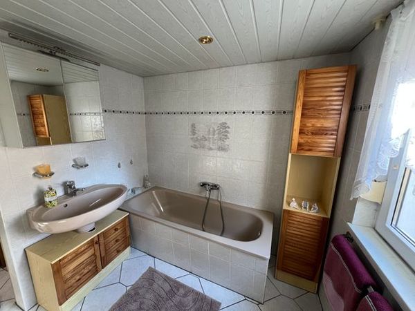 Das große, mit Badewanne und seperater Dusche versehene Badezimmer, schließt sich an der Küche an. Diese ist mit allem Wichtigen ausgestattet.