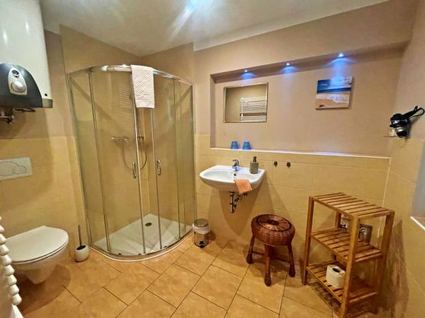 Bad im Erdgeschoss mit Dusche, WC, Fußbodenerwärmung und Handtuchtrockenheizkörper,