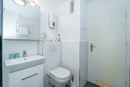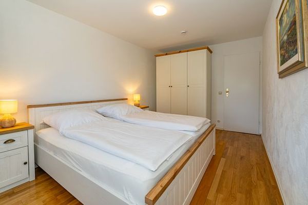 Komfortable Ferienwohnung, ca. 56 qm im Hochparterre zur Landseite mit Ostloggia (Morgensonne, mit Balkonmöbeln und Auflagen) für max. 3 Personen. Von der großzügigen Diele aus gelangt man in das Wohnzimmer, das Schlafzimmer und das neuwertige Duschbad/WC. Der Wohnraum besteht aus einer Sitzgarnitur (3-Sitzer-Schlafcouch, Liegefläche ca. 1,40 x 2,00 m, einem bequemen Ohrensessel mit Fußhocker), einem Essplatz direkt am Fenster, Kabel-TV, Stereoanlage mit Radio, WLAN und Zugang zur Ostloggia. Die Einbauküche mit Fenster ist mit Cerankochfeld (4 Felder), Geschirrspüler, Backofen, Mikrowelle, Kühlschrank mit Gefrierfach und Senseo-Kaffeemaschine ausgestattet. Eine Filterkaffeemaschine, Wasserkocher und Toaster gehören zur Grundausstattung. Das separate Schlafzimmer hat ein Doppelbett (1,80 x 2,00 m, mit guten Einzelmatratzen), 2 Nachttische und einen Kleiderschrank mit Zugang zum zweiten Balkon. Im Bad befinden sich eine großzügige Dusche mit extraflachem Einstieg, ein Waschtisch, Handtuchtrockner, Fön, Kosmetikspiegel und WC. An Extras stehen ein Bügelbrett und Bügeleisen zur Verfügung.