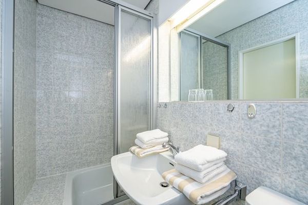 Im Bad befinden sich eine Dusche, ein WC und ein Waschtisch.