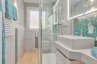 Das Wohlfühl-Badezimmer mit Fenster, ebenerdiger Regendusche, beleuchteten Spiegelelementen und Handtuchwärmer lädt auch an ungemütlicheren Tagen zur Entspannung ein.
