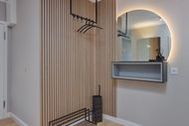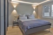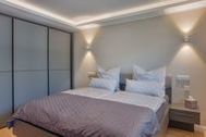 Die Ferienwohnung Seewind 2 verfügt im Schlafzimmer über ein bequemes, erhöhtes Doppelbett (180x200). Eine Entertainment-Ausstattung mit 4K-OLED-Smart-TV, SONOS-Soundambiente und Beleuchtungselementen gehört hier auch dazu. Ein großer Kleiderschrank und eine Kommode bieten viel Stauraum. Kofferständer, Bügeleisen/-brett, Erste-Hilfe-Set oder Safe sind für den Komfort vorhanden. Rollläden sorgen für Verdunklung.