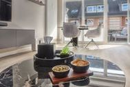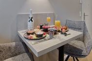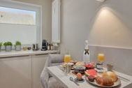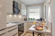 Die separate Küche mit kompletter Ausstattung (WMF), sowie Bistrotisch und Tresen Stühlen für den kleinen Hunger ist zudem sehr komfortabel. Ob Nespresso-Kaffeemaschine oder Weinkühler, es ist alles an Geräten und Utensilien vorhanden, was Sie für Ihren hochwertigen Urlaub erwarten. Der Kulinarik steht nichts im Wege. Dafür sorgt auch der Essbereich des Wohnzimmers mit Sitzkomfort und ausziehbarem Esstisch. Begrüßen Sie hier doch einfach Urlaubsbekanntschaften oder Freunde zum gepflegten Beisammensein. Eine Waschmaschine ist hier zudem komfortabel in der Küche integriert.