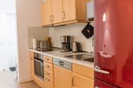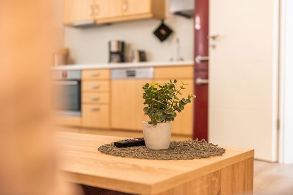 Neben einer gut ausgestatteten Einbauküche steht ein Backofen mit Ceranfeld, Kaffeemaschine, Toaster, Wasserkocher sowie ein Kühlschrank zur Verfügung.