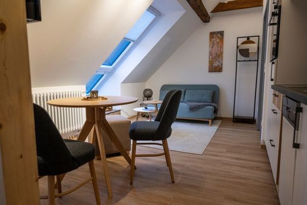Hell und freundlich gestaltete Dachwohnung für 2 bis 3 Personen. Die Wohnung verfügt über einen großzügigen Wohn-/Schlafraum mit bequemem Sofa, Doppelbett sowie eine offene, gut ausgestattete Küche und ein Bad.