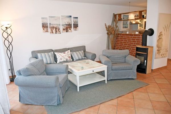Der großzügige Wohnbereich im Erdgeschoss mit vielen Fenstern und Kamin lädt zum Verweilen ein. Lassen Sie sich von dem wundervollen Blick auf die idyllische Boddenlandschaft verzaubern. Direkt an das Wohnzimmer grenzt die Gartenterrasse mit bequemer Sitzgruppe.