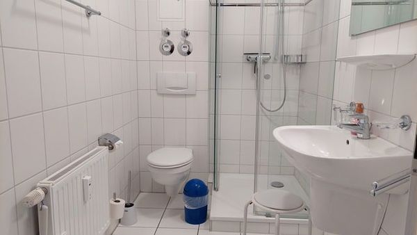 Vom Flur, samt Garderobe und Kleiderschrank, gelangt man ins Badezimmer, welches über Dusche und WC verfügt.