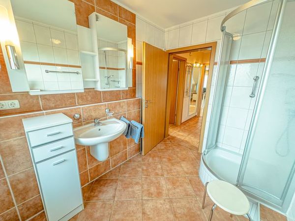 - Badezimmer mit Dusche, Waschtisch und WC