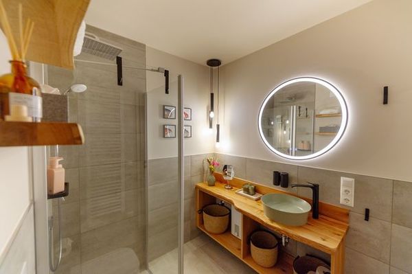 SEElig - es gibt kaum ein treffenderes Wortspiel, um die Wohnung zu beschreiben. Dieses tolle 2-Raum-Appartement mit großzügigen 80 qm Wohnfläche ist für bis zu 4 erwachsene Personen* ausgelegt. Neben dem unverbauten Ausblick auf den Bodden und der individuellen, hochwertigen Einrichtung gehören insbesondere Annehmlichkeiten wie ein Kamin und die private Sauna zu den besonderen Pluspunkten Ihres Urlaubsdomizils. So lässt es sich hier auch im Frühjahr, Herbst und Winter ganz wunderbar aushalten, zumal die Wohnung über W-LAN und einen Parkplatz nebst privatem Fahrradabstellraum in der hauseigenen Tiefgarage (max. Zufahrtshöhe 1,90 m) verfügt. Ihr Zuhause auf Zeit besteht aus einem kombinierten Wohn-/Esszimmer mit integrierter Küche, einem Schlafzimmer mit einem 1,80m breiten Boxspringbett, einer offenen, abdunkelbaren Galerie mit ausklappbarem 1,60m breitem Boxspring-Schlafsofa und Schreibtisch, sowie einem Badezimmer mit Dusche/WC und Sauna, einem separaten Schrankzimmer und einer Terrasse mit Lounge-Möbeln. Sie erreichen die Wohnung im Obergeschoss des Hauses über ein paar Stufen direkt von der Straße aus. Die moderne Einbauküche ist mit allem ausgestattet, damit Sie sich bequem selbst bekochen können, Wellenrauschen inklusive. Machen Sie es sich auf der Couch vor dem Kamin bequem, schauen Sie Smart-TV, hören Sie über das bluetoothfähige Internetradio Musik, schmökern Sie mal wieder ein gutes Buch oder lassen Sie einfach so die Seele baumeln und genießen das süße Nichtstun. Aber eigentlich ist die Insel Rügen viel zu schön, um nicht wenigstens ein paar Mal auf Entdeckungstour zu gehen. Wenn Sie keine eigenen Fahrräder dabei haben, können Sie sich in Göhren oder Baabe welche ausleihen. Das idyllische Fleckchen Erde bietet ideale Voraussetzungen für einen rundum erholsamen Urlaub. Den Bodden für ein paar Schwimmzüge direkt vor der Haustür, sind es zu den schier endlosen Sandstränden der Ostsee bei Lobbe, Göhren und Thiessow nur wenige Fahrminuten. In dem kleinen alten Fischerort Alt Reddevitz verwöhnen urige Restaurants und Cafés Sie zwischen Ostern und Ende Oktober mit frischer regionaler Küche und leckerem Kuchen. Das umliegende Hügelland bietet zahlreiche Wanderwege, zu Fuß, mit dem Rad oder zu Pferd. Angeln, alle möglichen Arten von Wassersport, oder einfach nichts tun - auf Mönchgut sind Ruhesuchende wie auch Abenteurer bestens aufgeboben. Lassen auch Sie sich verzaubern. Unsere Inklusiv-Leistungen für Sie: