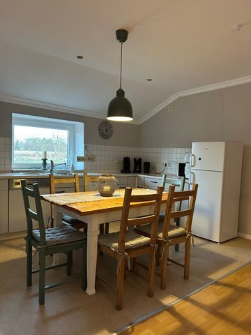 Geräumige Ferienwohnung mit Diele. Großzügige Küche mit Esstisch für 4 bis 6 Personen. Gemütliche Couchecke mit Blick auf die Weiden. Überdachte Terrasse mit Zugang zum gemeinschaftlichen Garten.