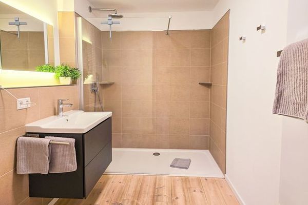 - Badezimmer: Modernes Bad mit ebenerdiger Regendusche, Handtuchtrockner und Haartrockner