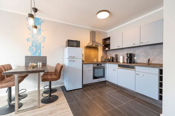- Einen Wohn- und Essbereich mit einer voll ausgestatteten Küche,