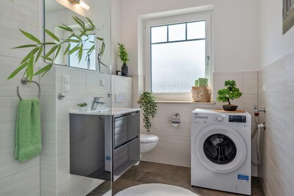 Im Erdgeschoss finden Sie zudem ein Duschbad mit Sauna, perfekt für entspannte Wellness-Tage. Eine hochwertige Massivholztreppe führt in das ausgebaute Dachgeschoss, wo Sie zwei gemütliche Schlafzimmer erwarten. Eines ist mit zwei Einzelbetten ausgestattet, das andere mit einem komfortablen Doppelbett, einem großen Kleiderschrank und einem Schreibtisch. Die charmanten Dachschrägen sorgen für ein behagliches Ambiente und bieten dennoch ausreichend Raumhöhe. Das Badezimmer im Obergeschoss ist mit einer großzügigen, ebenerdigen Dusche und einem Waschtrockner ausgestattet.