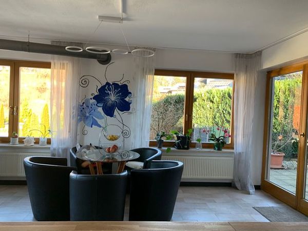Die offene, moderne Einbauküche mit Kochinsel ist in den großzügigen Wohn- und Essbereich integriert und hat direkten Zugang zur überdachten Terrasse perfekt für gemütliche Abende im Freien. Ein sonnengeschützter Gartenbereich und ein Balkon laden ebenfalls zum Verweilen ein. Zudem verfügt die Wohnung über einen Hobbyraum, der zusätzlichen Raum für Freizeitaktivitäten bietet. Ausreichend Stellplätze für Fahrzeuge sind ebenfalls vorhanden.