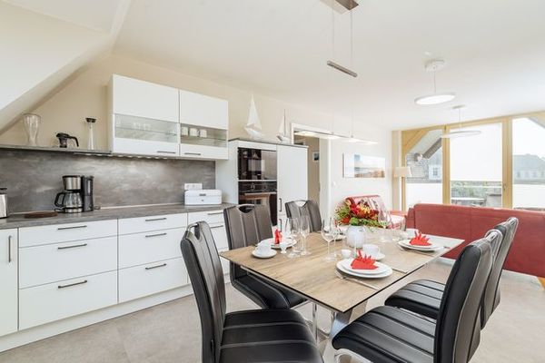 Der Hafenkieker mit seinen 99 m² ist eine Ferienwohnung für max. 4 Personen. Sie liegt im Obergeschoß eines neugebauten Feriendomizils. Die Wohnung hat 2 Schlafzimmer mit je einem Boxspringbett in der Größe 2,00 x 1,80 m. Das Badezimmer ist ausgestattet mit einem großen Waschtisch, einer ebenerdigen Dusche, einer elektrischen Fußbodenheizung, einem Handtuchheizkörper und einer Sauna. Im HWR befindet sich eine Siemens - Waschmaschine. Der offene Wohn-/Küchenbereich ist hell und freundlich. Eine Schreib- und Leseecke bietet eine Rückzugsmöglichkeit. Vom Balkon in Südausrichtung wird man zum Hafenkieker.