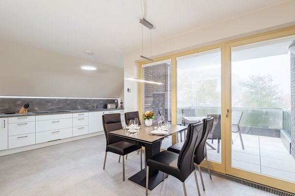 Unser lütt Schiedbüdel mit seinen 73 m² liegt im Obergeschoß eines neu gebauten Areals. Die Wohnung ist geeignet für max. 2 Personen. Das Schlafzimmer in Nordausrichtung ist mit einem Boxspringbett von der Größe 2,00 x 1,80 m ausgestattet. Der offene Wohn-/ Küchenbereich mit sich anschließendem Balkon liegt in Westausrichtung, ist hell und freundlich. Das Tageslichtbad hat einen großen Waschtisch, einen Handtuchheizkörper, eine elektr. Fußbodenheizung und eine ebenerdigen Dusche.