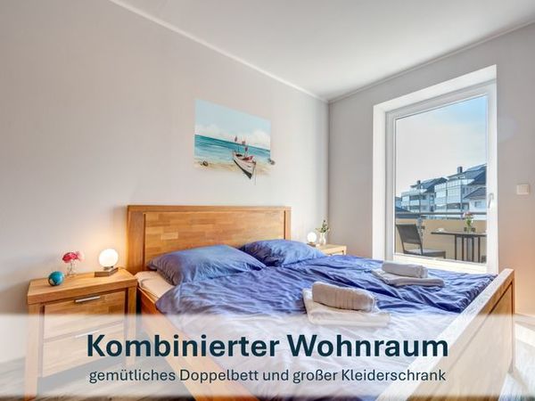 Die Ferienwohnung Nr.17 liegt im linken Obergeschoss der Anlage und ist als gemütliches 1-Raum-Apartment konzipiert. Der kombinierte Wohn- und Schlafbereich ist offen gestaltet und mit einem komfortablen Doppelbett sowie einer vollwertig ausgestatteten Küche eingerichtet. Zur Küchenausstattung gehören Spülmaschine, Kühlschrank mit Gefrierfach, Cerankochfeld mit Backofen, Mikrowelle, Wasserkocher, Toaster und Kaffeemaschine - ideal für einen entspannten Aufenthalt.