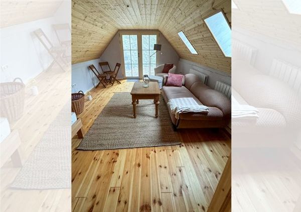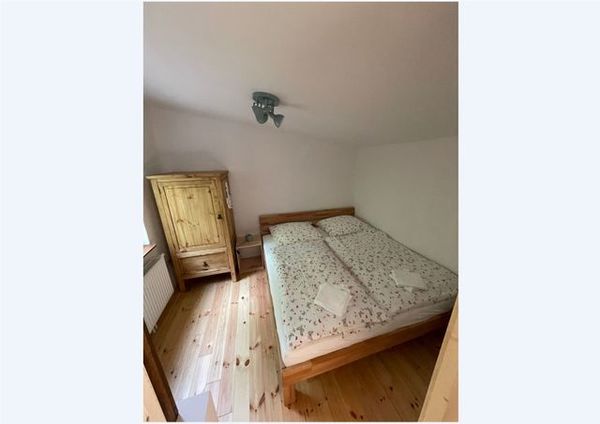 Das zweite Häuschen, Antons Remise, liegt hinter Ellas Gehöft und überzeugt durch ebenso viel Charme. Im Erdgeschoss finden Sie eine gut ausgestattete Küche, ein Wohnzimmer mit Kachelofen und ein Badezimmer mit Dusche und WC. Auch hier führt eine steilere Treppe ins Obergeschoss, wo sich zwei Schlafzimmer mit Doppelbetten befinden.