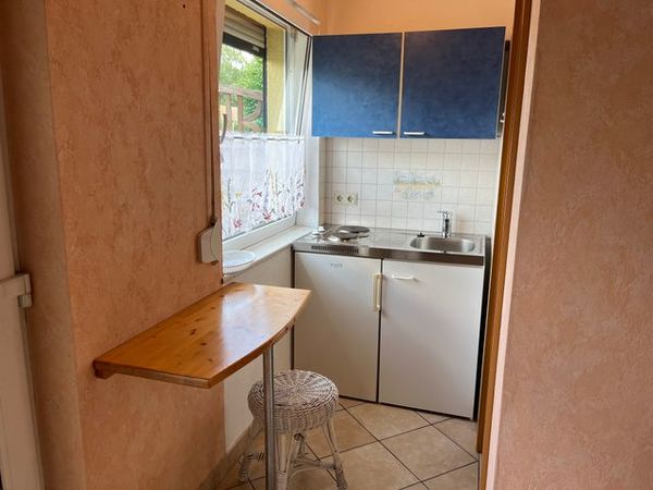 2-Raum-Ferienwohnung im Erdgeschoß, einfach und zweckmäig eingerichtet. Wohnzimmer mit kleine Kochnische mit 2-Plattenherd, Kühlschrank, Mikrowelle, Toaster, Wasserkocher und Kaffeemaschine. 1 Schlafzimmer im Souterrain mit Doppelbett. Bad mit Dusche und WC. Terrasse direkt an der Wohnung mit Gartenmöbel.