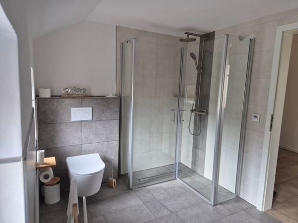 Im Bad gibt es eine geräumige ebenerdige Regendusche, einen Waschtisch mit Stauraum, eine wassersparende moderne Toilette, sowie Waschmaschine und Trockner. Ein Föhn steht euch ebenfalls zur Verfügung.