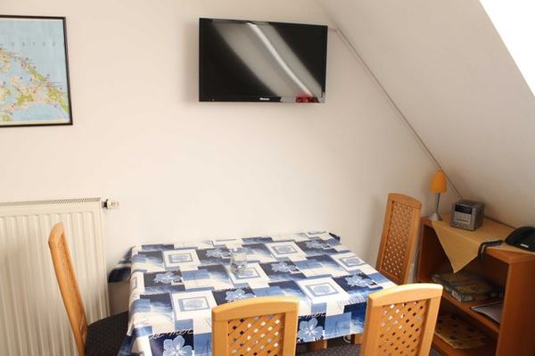 Sie wohnen in einer 45 qm großen 3-Raum Komfort-Dachgeschoß-Wohnung für 4 Personen. Der helle Wohnbereich hat eine komfortable Wohnlandschaft mit Essbereich. Die angrenzende, offene Küchenzeile ist ausgestattet mit einen 2 Platten Kochfeld, Kühlschrank, Spülmaschine und Kaffeemaschine. Über eine Raumspartreppe (steile, gewendelte Treppe, nicht geeignet für Ältere & Kleinkinder) erreichen Sie die beiden Schlafräume. Ein Schlafraum verfügt über ein Doppelbett mit Kleiderschrank, das andere Schlafzimmer hat 2 Einzelbetten und einen Kleiderschrank. Das Bad verfügt über eine Dusche, Waschbecken und WC. Die Dachgeschosswohnung ist mit Direktwahltelefon, WLAN und LED TV ausgestattet. Auf dem Grundstück steht den Gästen eine Terrasse zur Verfügung. Die Erstausstattung Bettwäsche und Handtücher ist bereits inklusive.