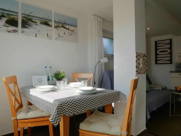Die helle, mit Liebe zum Detail eingerichtete und mit separatem Eingang ausgestattete 2-Zimmer-Ferienwohnung ist ca. 50m² groß. Die Wohnung hat zwei separate Schlafzimmer und bietet Platz für 3 Personen. Im Souterrain-Bereich gelangen Sie direkt in die gemütliche Wohnküche mit Essecke. Über einen Flur mit Garderobe sind die beiden Schlafzimmer und das große Badezimmer zu erreichen. Eines der beiden Schlafzimmer verfügt über ein Doppelbett (1,80 x 2,00m) das andere Schlafzimmer über ein Etagenbett. Das Etagenbett hat unten eine Schlaffläche von 1,40 x 2,00m und oben 0,90 x 2,00m.
