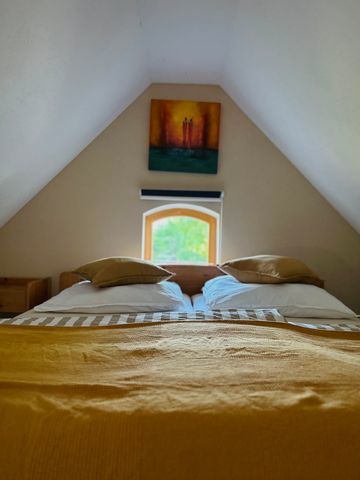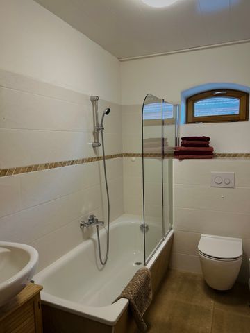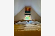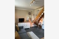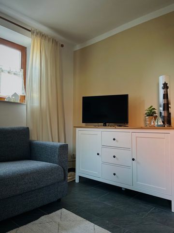 moderne Ausstattung auf 2 Etagen, Dachgeschoss mit schrägen Wänden und niedriger Deckenhöhe, Nichtraucherwohnung, Fußboden mit Fliesen und Laminat, 1 Schlafzimmer mit Doppelbett 180 cm x 200 cm, 1 Schlafcouch im Wohnraum, TV, Fußbodenheizung und Holzofen, 1 Bad mit Badewanne und WC