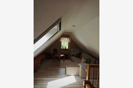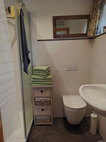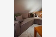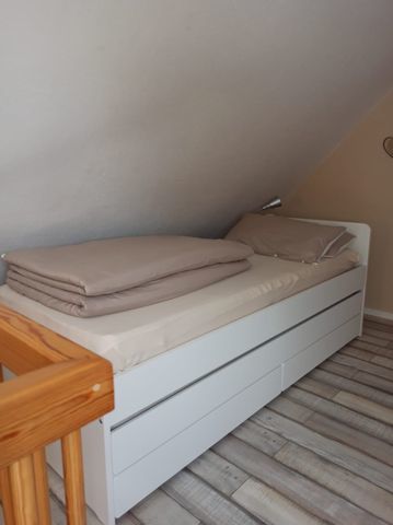 moderne Ausstattung auf 2 Etagen, Dachgeschoss mit schrägen Wänden und niedriger Deckenhöhe, Nichtraucherwohnung, Fußboden mit Fliesen und Laminat, 1 Bett 90 cm x 200 cm und 1 Doppelbett 180 cm x 200 cm, Fußbodenheizung und Elektroheizung. Eine Waschmaschine ist vorhanden.
