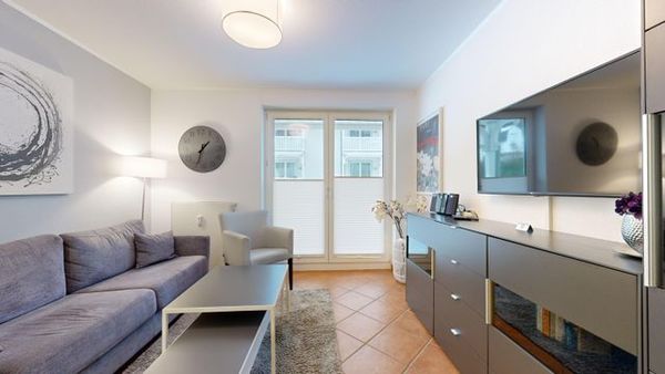 Komfort-Ferienwohnung im Erdgeschoss, Typ A (2 Zimmer / 40 m²) des Appartementhauses Binzer Sterne, 1 Schlafzimmer, Parkplatz (gegen Gebühr) und freies WLAN.