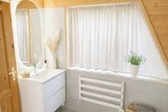 Das Obergeschoss erreichen Sie über eine schmale Treppe. Dort befinden sich zwei Schlafzimmer. Ein großes Schlafzimmer mit einem Doppelbett und zwei Einzelbetten, sowie ein weiteres kleineres Schlafzimmer mit zwei Einzelbetten. Vom großen Schlafzimmer aus gelangen Sie auf den Balkon im Obergeschoss. Von dort aus können Sie den Blick über Wiesen und Felder genießen. Im Erdgeschoss, sowie im Obergeschoss gibt es Plissee und Vorhänge vor den Fenstern.