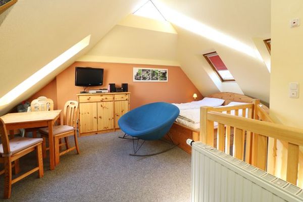 Ein Schlafzimmer mit Doppelbett 2 x 90 x 200 cm befindet sich unteren Geschoss. Das zweite Schlafzimmer befindet sich im Dachgeschoss und ist zur Treppe hin offen. Der Schlafraum ist ausgestattet mit einem Doppelbett 2 x 90 x 200 cm. Im oberen Schlafzimmern ist Platz für mindestens 1 Baby, das noch im Babybett schläft.