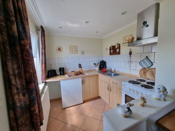 gut ausgestattete Küche mit E-Herd, Wasserkocher, Kaffeemaschine, Toaster, Kühlschrank, Eierkocher, Gläser, Geschirr, Besteck, SAT-TV, Radio