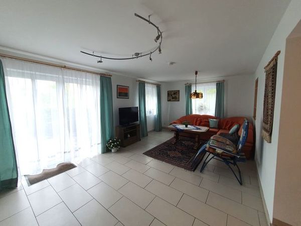 Die Wohnung verfügt über ein Schlafzimmer, einen Vorraum für das Schlafzimmer (ohne Türe zum Schlafzimmer), ein zusätzliches Zimmer mit einem Boxspringbett, einen großen Flur, ein sehr großes helles Wohnzimmer und einer Küche mit Essecke. Es ist eine Erdgeschoßwohnung mit einer Stufe.