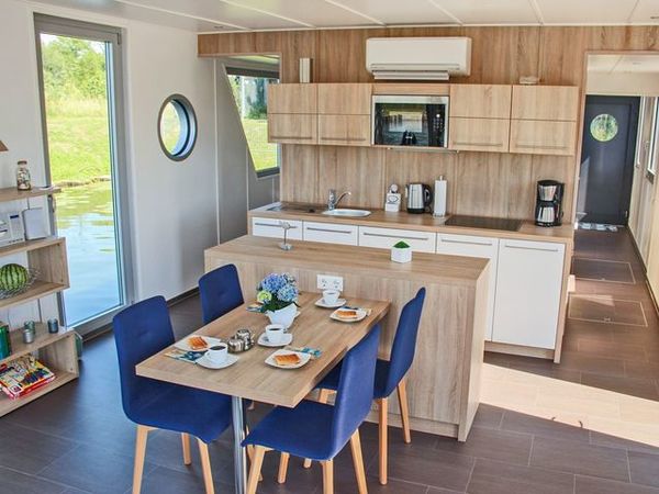 Floating House Xenia liegt ruhig am Rand der Marina Ueckermünde mit direktem Blick auf das Wasser und nur einen kurzen Spaziergang vom feinsandigen Strand entfernt. Das modern und maritim gestaltete Hausboot bietet mit seinen 55m² Wohnfläche und zwei separaten Schlafzimmern Platz für bis zu 3 Personen. Damit ist Xenia ideal für Paare oder kleine Familien, die einen entspannten Urlaub in Wassernähe suchen. Im Inneren erwartet dich ein großzügiger Wohnbereich mit gemütlicher Eck-Couch, einem Esstisch und einer offen integrierten Küche. Diese ist ausgestattet mit Ceran-Kochfeld (2 Platten), Mikrowelle, Spülmaschine, Kühlschrank, Kaffeemaschine, Toaster, Wasserkocher und allem, was du für die Zubereitung deiner Lieblingsgerichte brauchst. Große Fensterfronten lassen viel Licht herein und holen dir das Wasser direkt ins Wohnzimmer. Das Schlafzimmer mit Doppelbett (160x200) sowie ein weiteres mit Einzelbett (90x200) bieten dir ruhige Rückzugsorte mit Wohlfühlatmosphäre. Die komfortable Regen-Dusche und das separate WC mit Waschbecken sorgen für den täglichen Komfort. Als besonderes Highlight erwartet dich an Bord eine Infrarot-Wärmekabine für zwei Personen perfekt für entspannte Stunden, wenn draußen mal eine frische Brise weht. Noch mehr Urlaubsgefühl schenkt dir die großzügig möblierte Dachterrasse. Ausgestattet mit Sofa, Sesseln, Liege und Sonnenschirm ist sie dein privater Lieblingsplatz zum Sonnenbaden, Lesen oder einfach zum Schiffe-Gucken. Selbstverständlich steht dir auch ein kostenfreier Parkplatz am Hafen zur Verfügung. An Bord findest du außerdem Sat-TV, Radio und CD-Player und eine Klimaanlage mit Heizfunktion. Ein kleiner, gut erzogener Hund ist bei uns herzlich willkommen.Bei den Fotos handelt es sich um Beispielfotos, die Ausstattung kann abweichen.